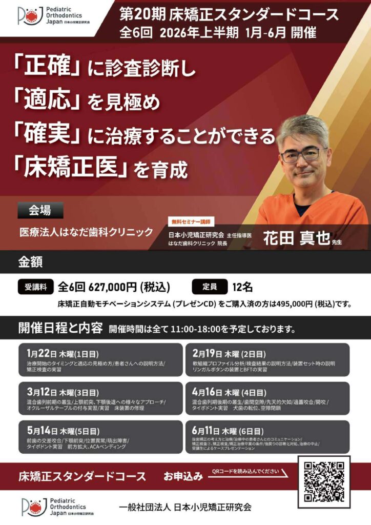 講師は日本床矯正研究会 指導医の花田真也先生です。受講することで、日本床矯正研究会への入会資格も得られます。